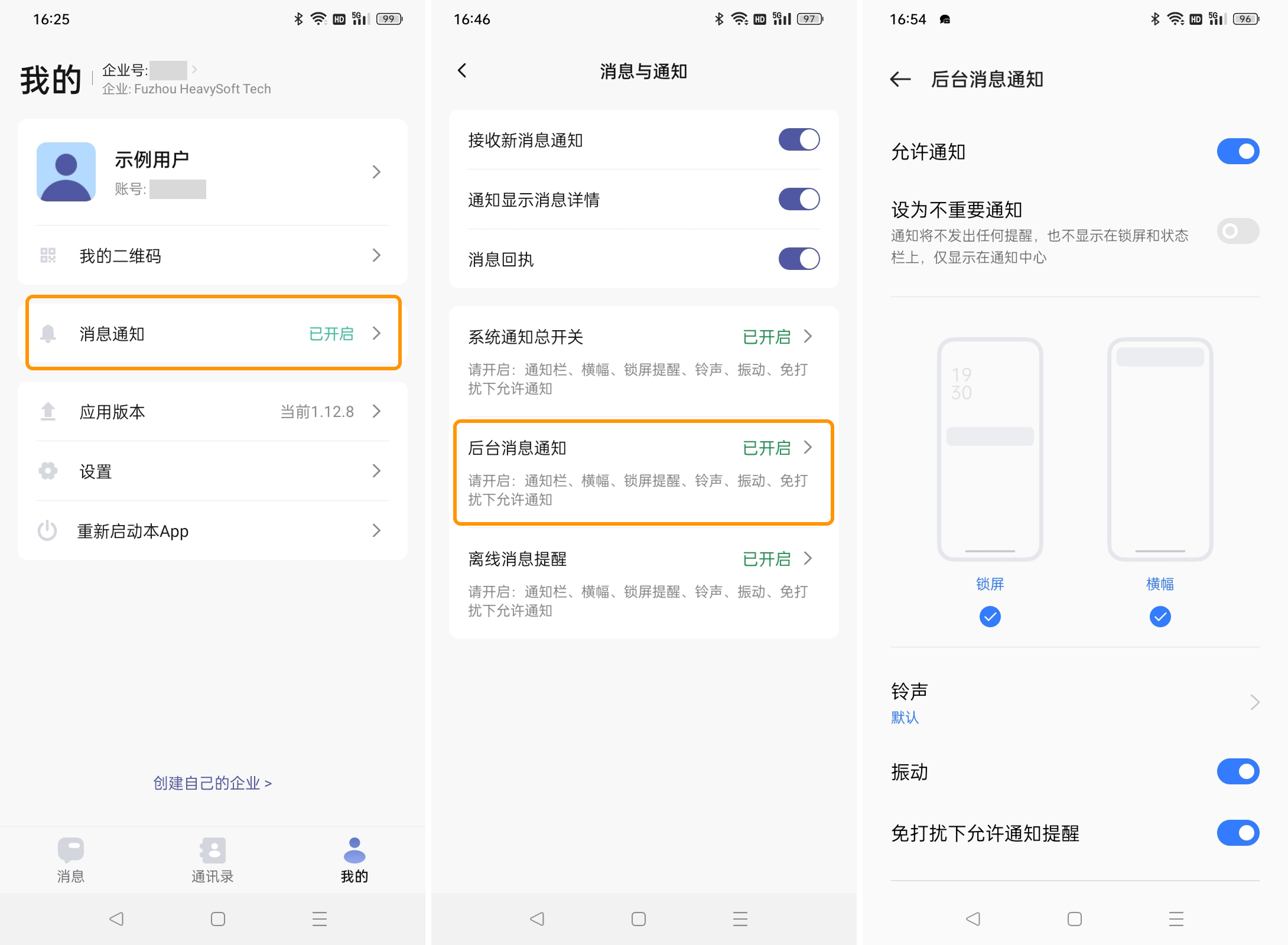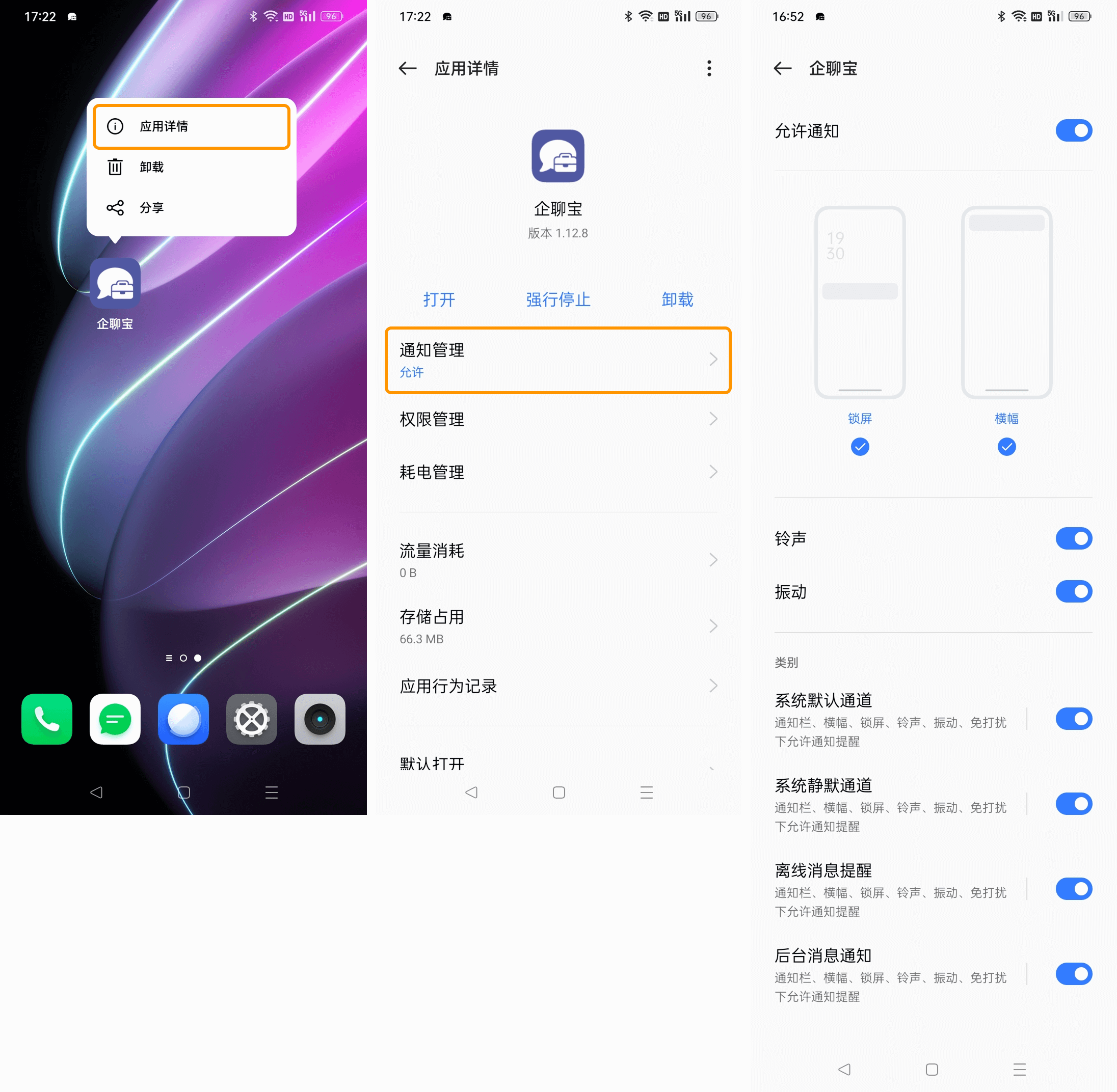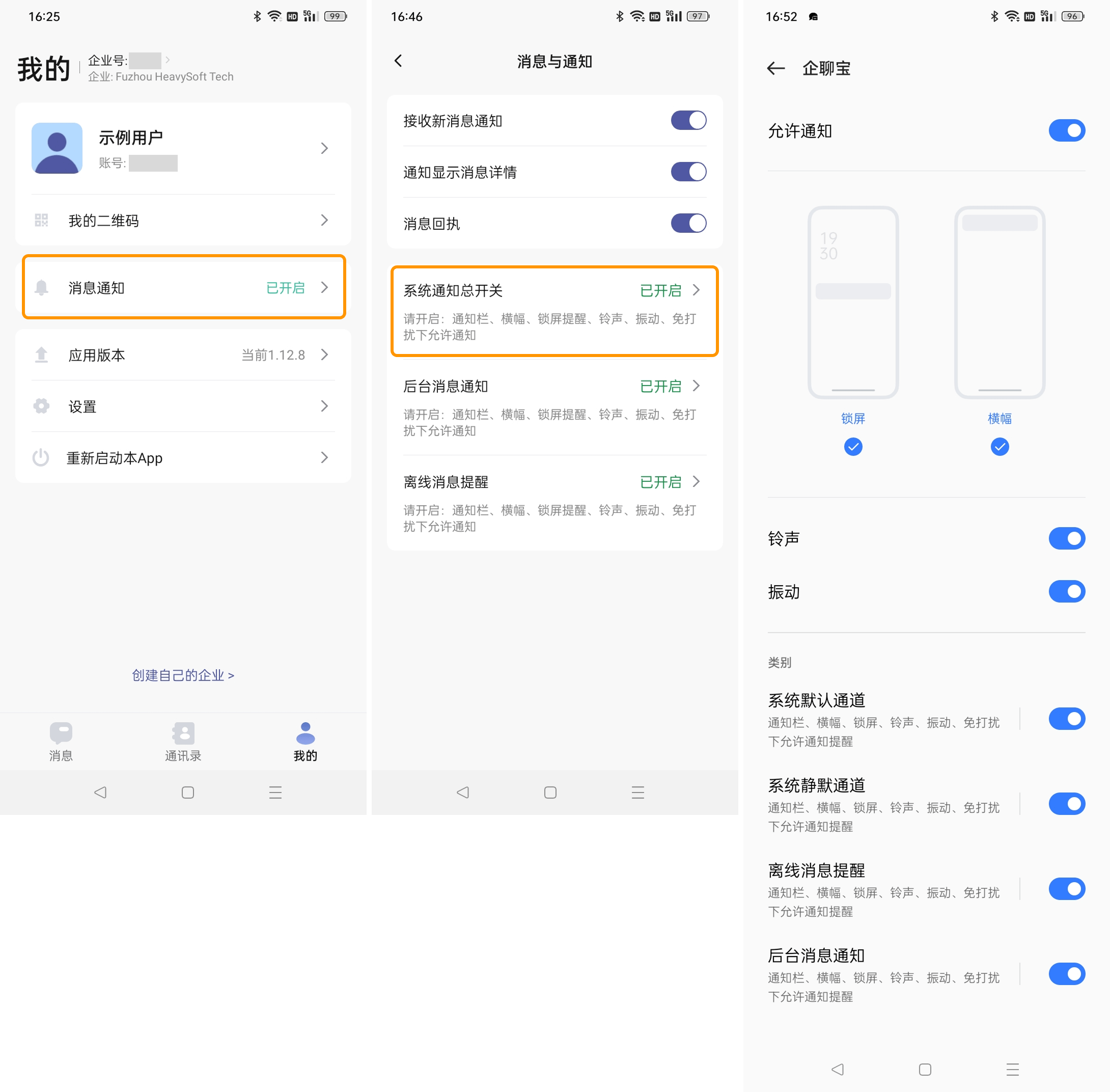 或者在手机的 设置->应用管理或应用设置->找到“企聊宝”App->打开通知管理或通知设置。