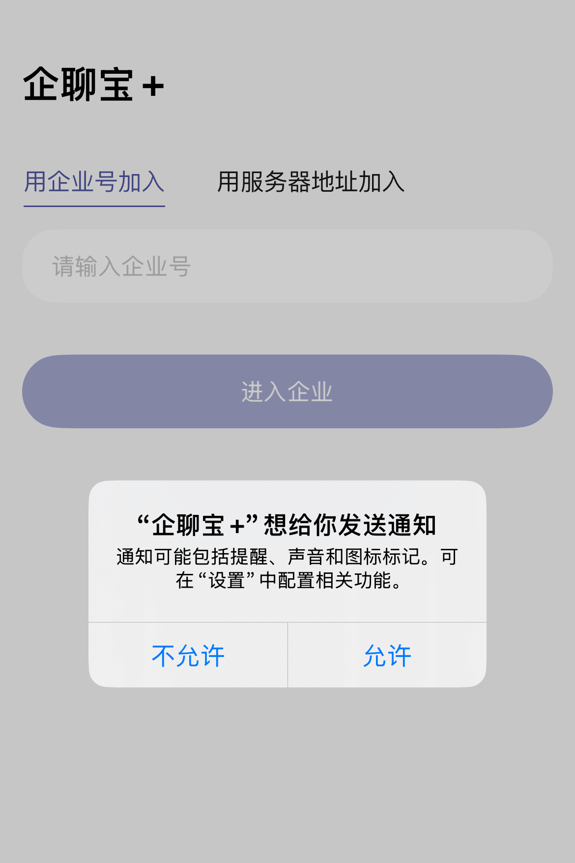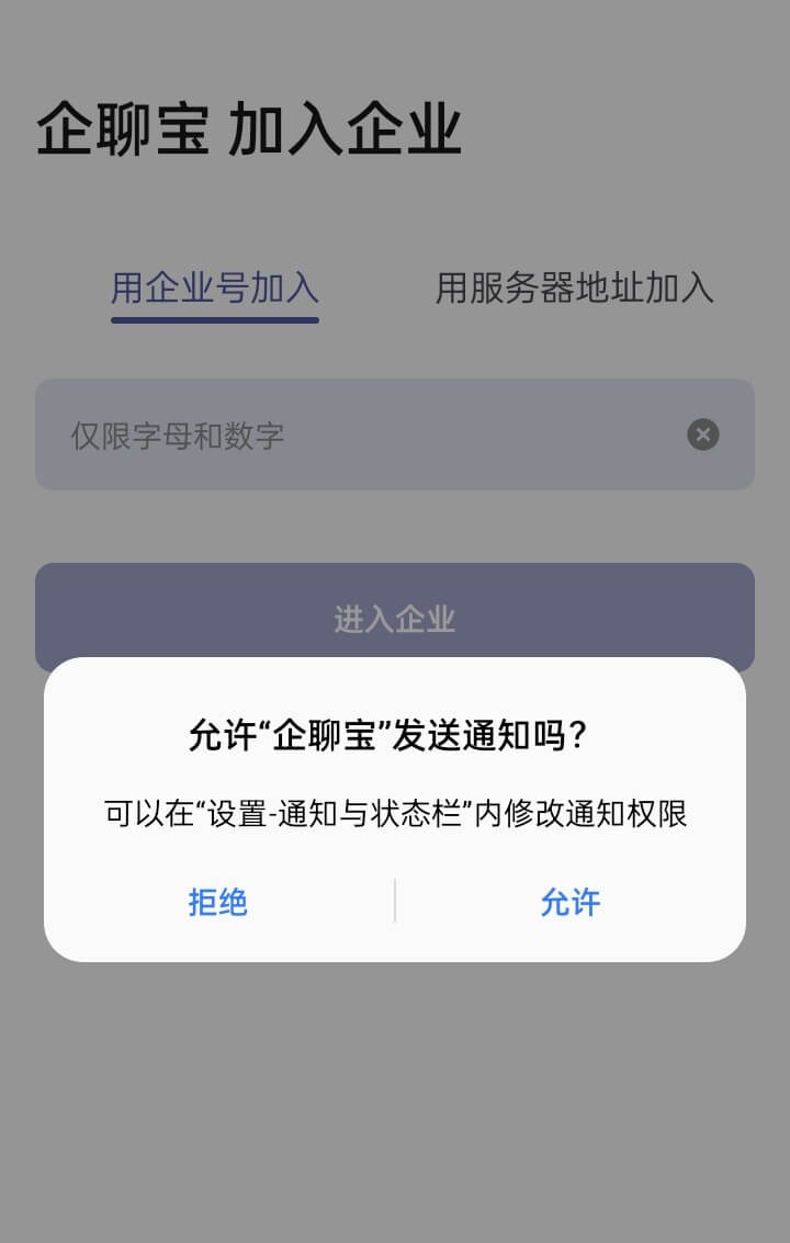 如果手机没有自动开启“企聊宝”App 的通知功能,App 在第一次启动时会提示要开启消息通知功能,此时请您点击“允许”。
