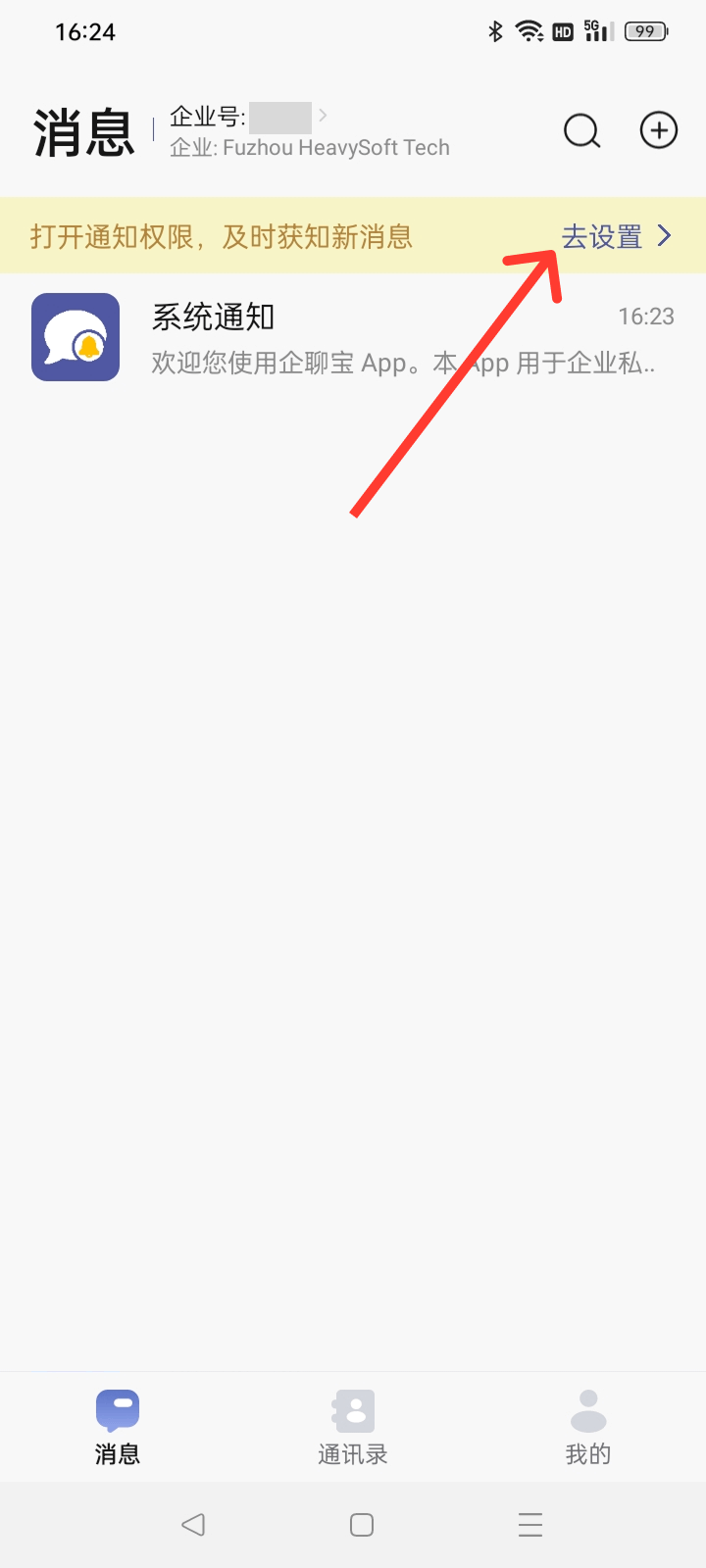 如果第一次启动 App 时没有打开消息通知,在“企聊宝”App 首页顶部将出现打开通知的提示条,此时请点击“去设置”将打开系统的 App 设置页面,在那里可以开启通知相关功能。