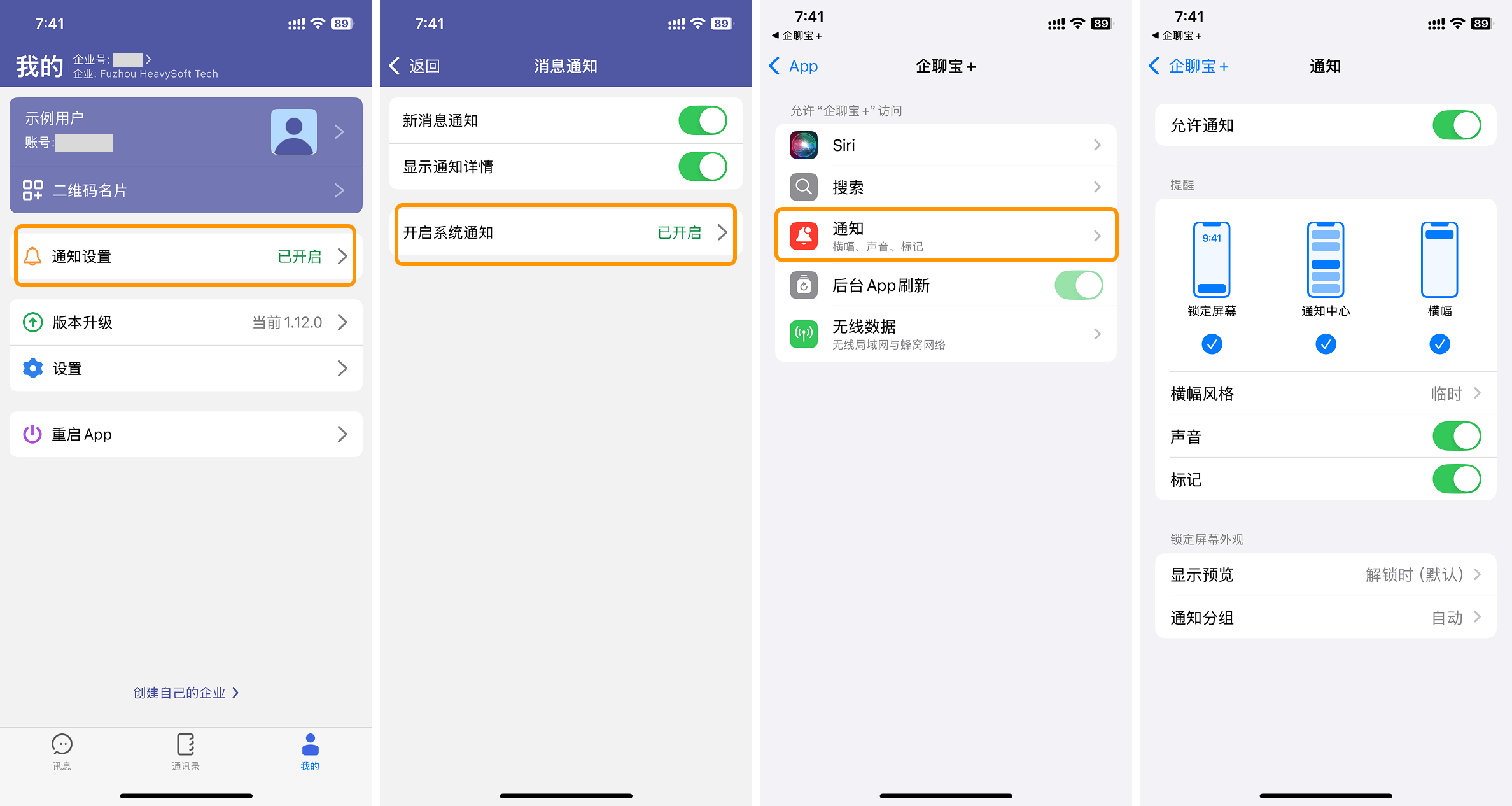 在“企聊宝”App 里找到 我的->通知设置->开启系统通知,点击会到达 App 在手机系统的设置页面,再打开“通知”,再开启里面的各项通知功能即可。