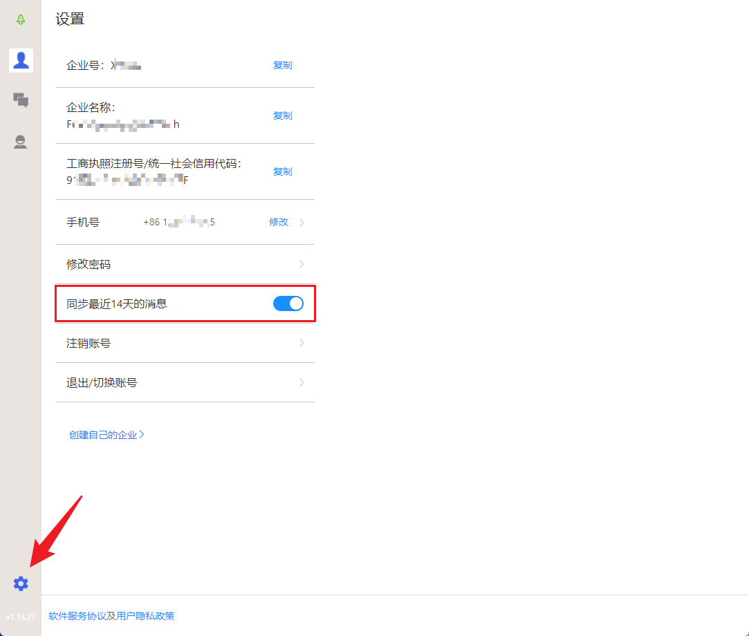 打开窗口 -> 左下方设置 -> 同步最近 14 天的消息